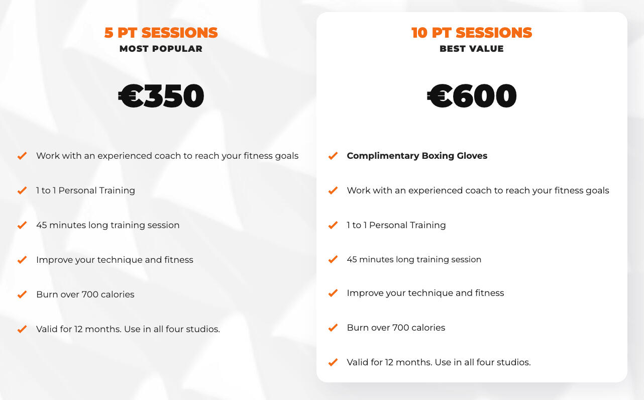 Below are prices for our 5 or 10 session packages. We recommend you try a 45 minute introductory 1-1 Personal Training session tailored to you before signing up for a 5 or 10 session package.The intro PT is priced at a discounted rate of €39 (normally €70).